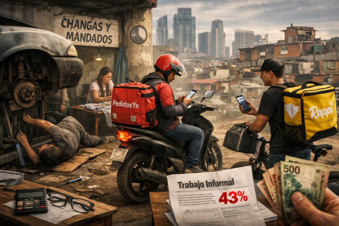 Los datos son elocuentes: la informalidad laboral alcanza aproximadamente al 43,3% de los trabajadores, y si se suman los cuentapropistas informales, el fenómeno se acerca al 45% del total de ocupados. No se trata de una economía marginal, sino de una porción estructural del sistema productivo.