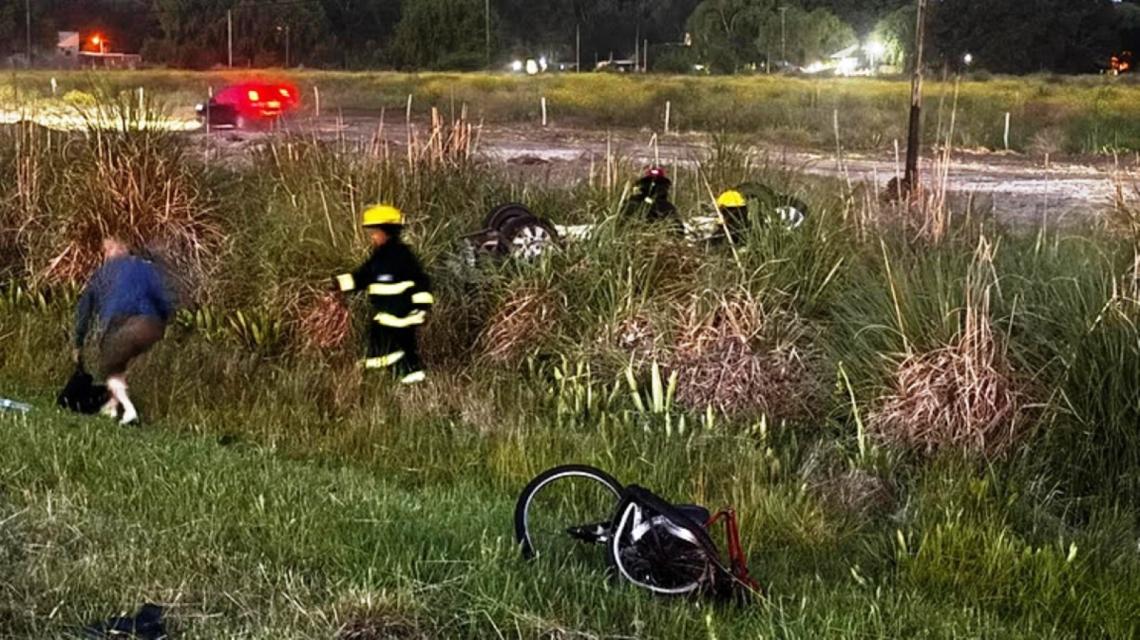 Tras un llamado de emergencia al 911, personal policial se dirigió al lugar y se encontró con un automóvil volcado a pocos metros de la ruta, mientras que la bicimoto estaba completamente destruida, más cerca de la banquina.